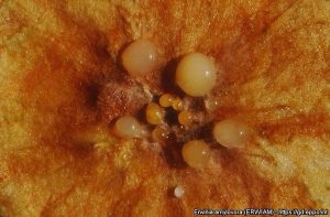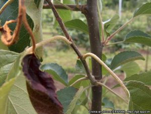 Після цвітіння найбільш сприйнятливими до інфекції стають молоді пагони. Верхівкові молоді пагони в’януть, утворюючи характерний гачкоподібний згин у вигляді пастушої палиці. Кора стає водянистою, на ній виступають крапельки молочно-білого ексудату.