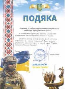 Колектив ДУ «Черкаська фітосанітарна випробувальна лабораторія Держпродспоживслужби» отримав подяку від ГО “НЕБАЙДУЖІ ЧЕРКАСИ” за постійну вагому благодійну допомогу для поранених та травмованих військовослужбовців-Захисників України.
